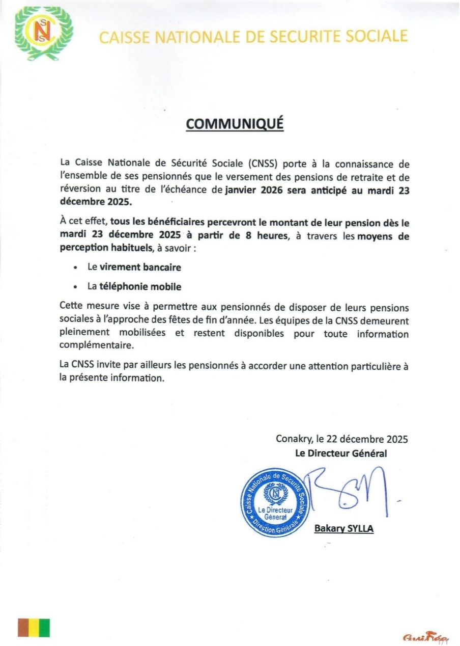 La Caisse Nationale de Sécurité Sociale (CNSS) informe l’ensemble de ses pensionnés qu’elle procèdera par anticipation au versement des pensions de retraite et de réversion au titre de l’échéance de janvier 2026.