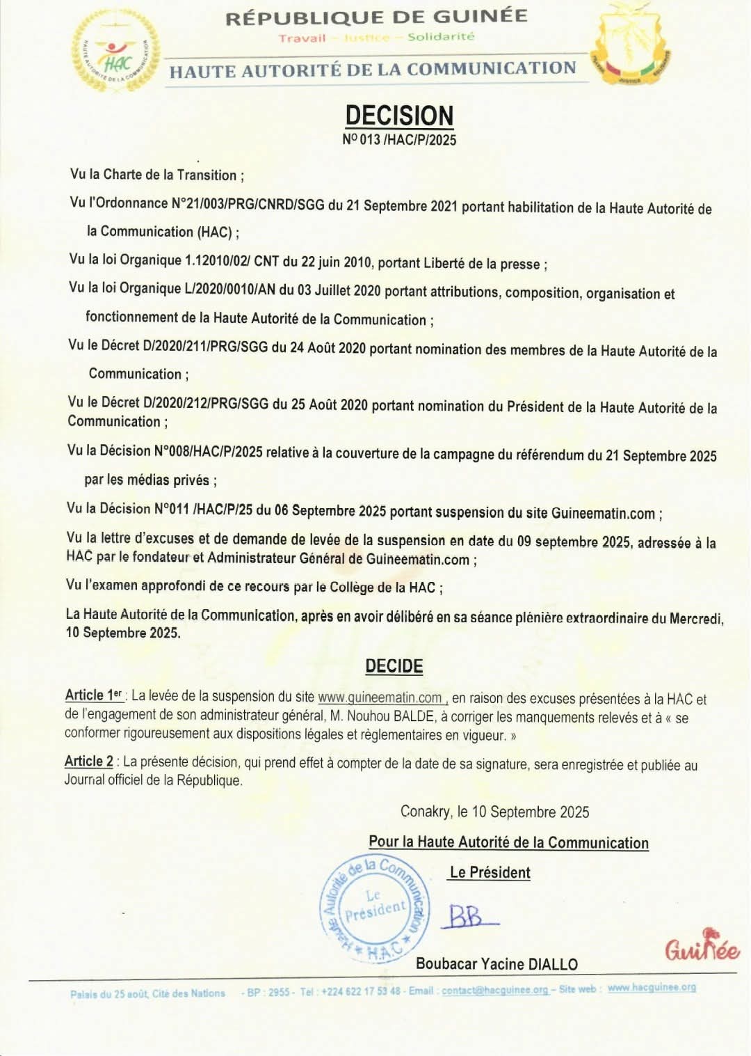 La haute autorité de la communication a décidé de lever la suspension du media électronique guinéematin .com ce mercredi 10 septembre 2025.